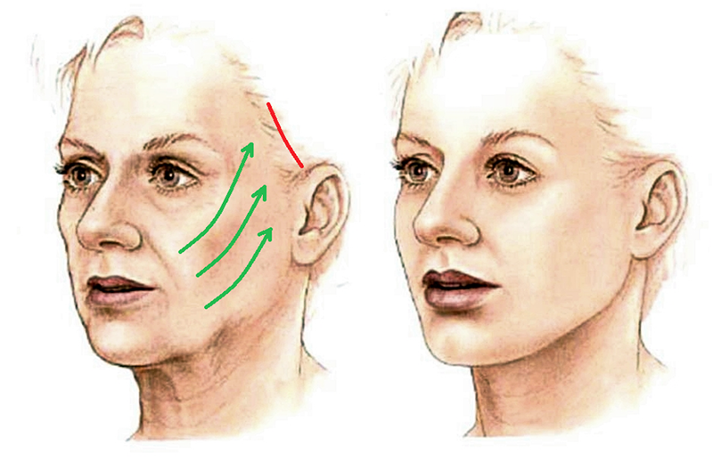 Quy trình: Bác sĩ thực hiện một vết mổ khéo léo, thường bắt đầu ở vùng thái dương, kéo dài xuống phía trước tai và kết thúc ở vùng chân tóc phía sau tai.